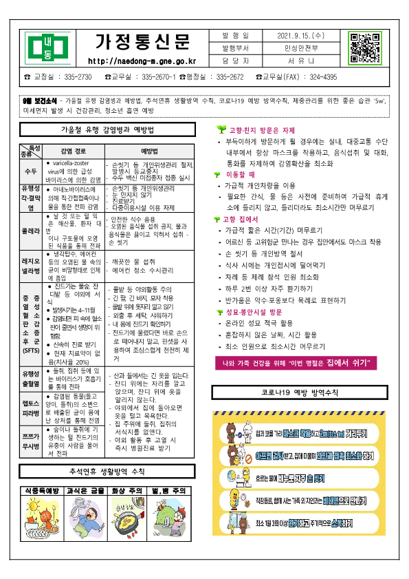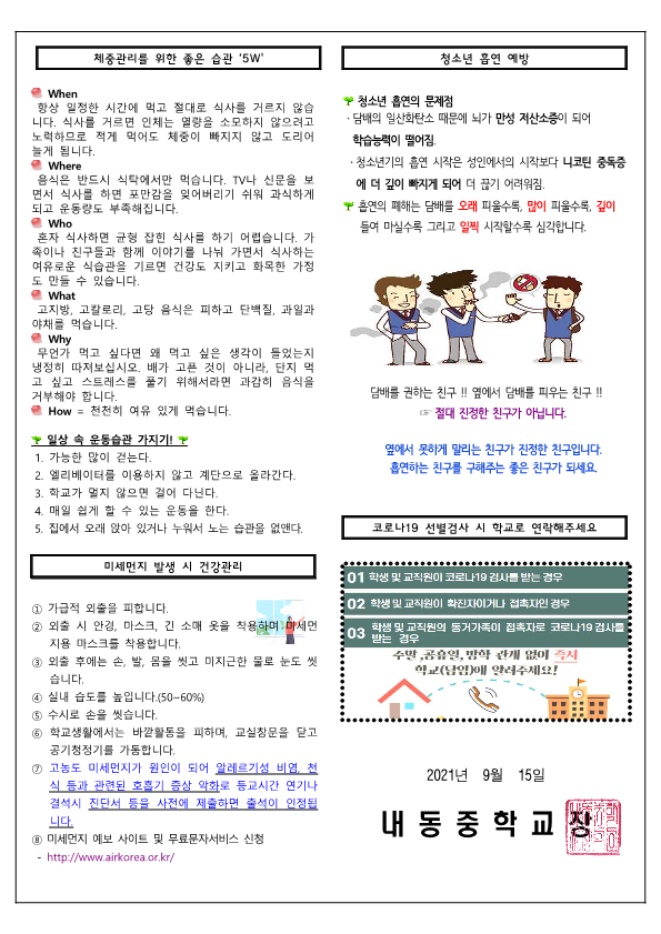 9월 보건소식지에는 가을철 유행 감염병과 예방법, 추석연휴 생활방역 수칙, 코로나19 예방 방역수칙, 체중관리를 위한 좋은 습관 ‘5w', 미세먼지 발생 시 건강관리, 청소년 흡연 예방에 대한 내용을 담았습니다. 참고하시기 바랍니다.