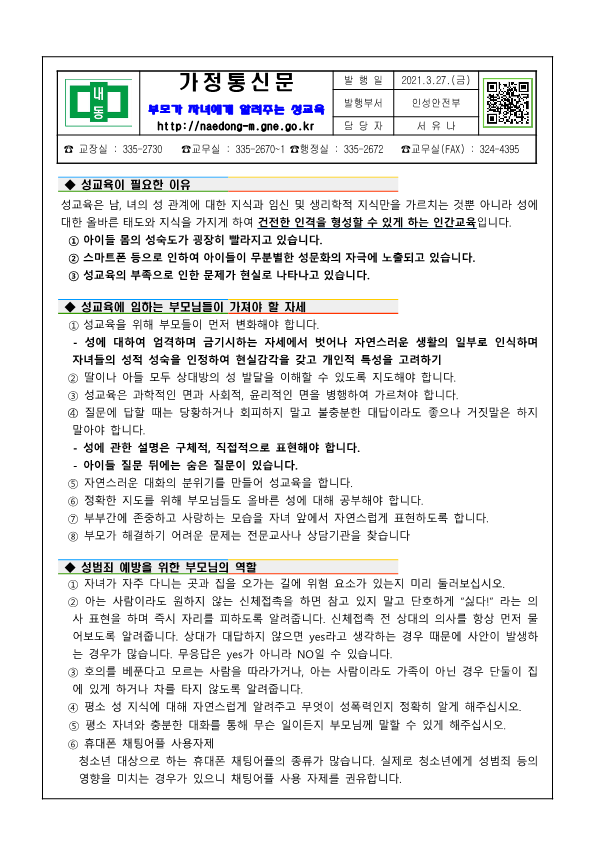 <부모가 자녀에게 알려주는 성교육> 이란 내용을 담은 가정통신문을 게시합니다.