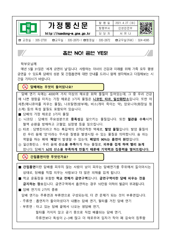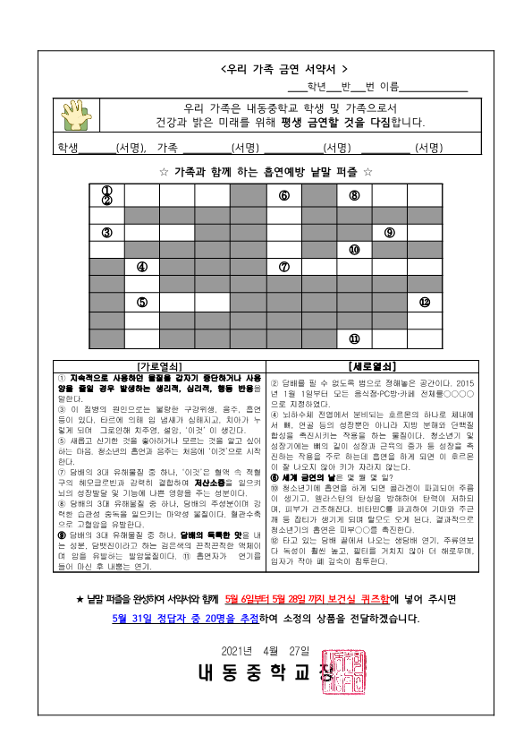 안녕하십니까? 5월 31일 '세계 금연의 날' 을 맞이하여 가족과 함께 퀴즈를 풀고 우리가족 금연서약서 쓰기 캠페인을 하려고 합니다. 가정통신문 뒷편에 있는 퀴즈를 풀고 제출하면 소정의 기념품을 드릴 예정입니다.~^^ 많은 참여 부탁드립니다.!