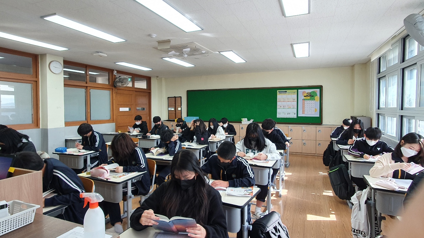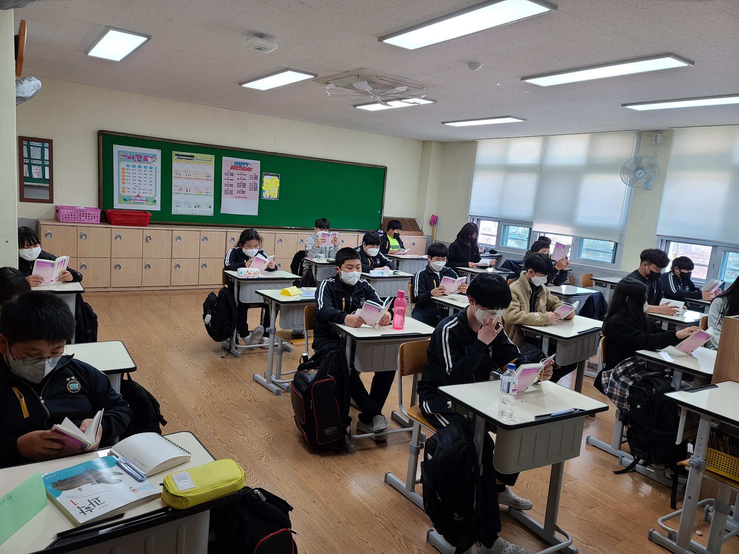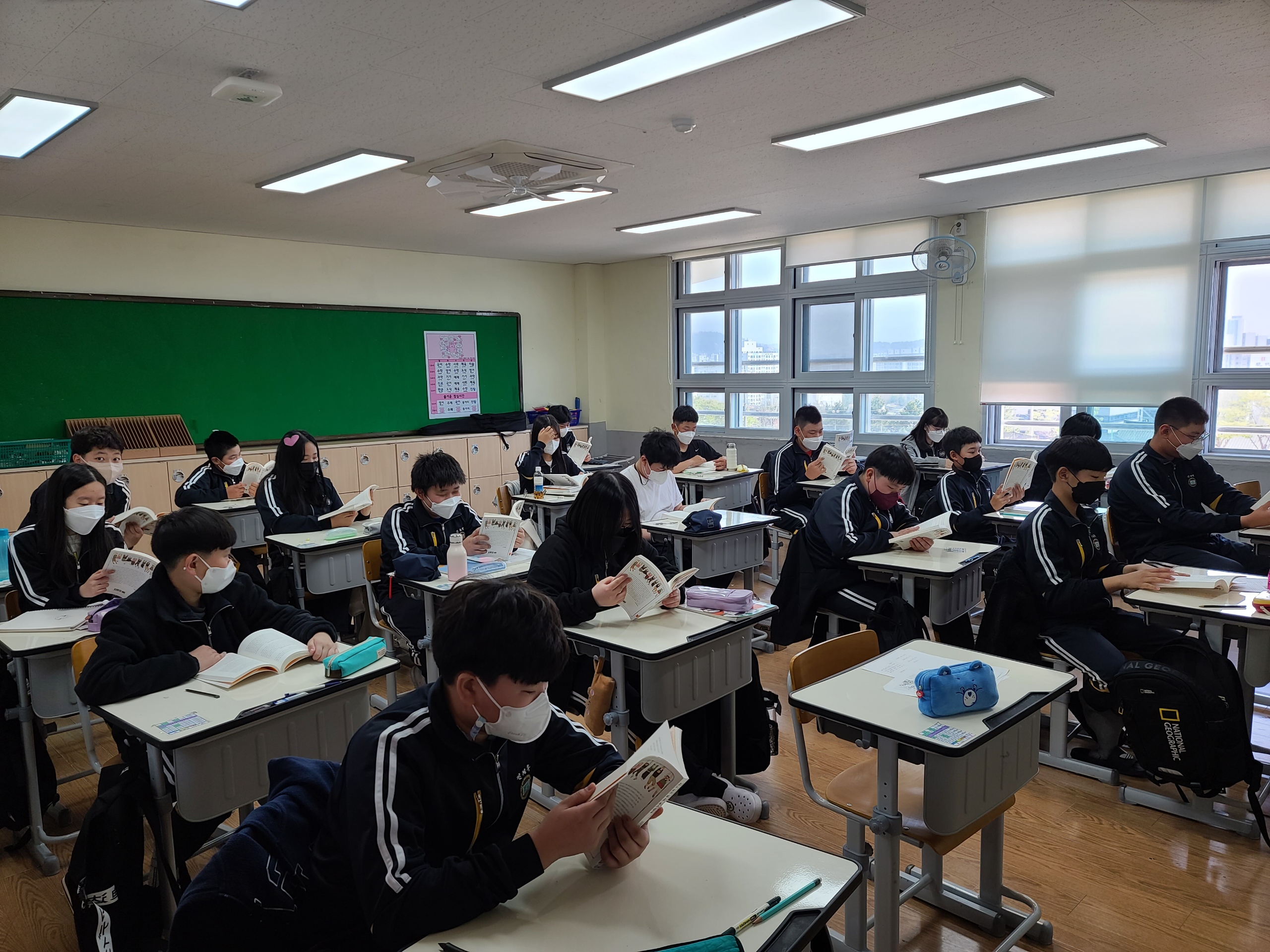 본교 전교생이 아침 시간을 활용하여 담임교사와 독서로 함께하는 사제와 함께하는 동행 독서 하는 모습입니다.