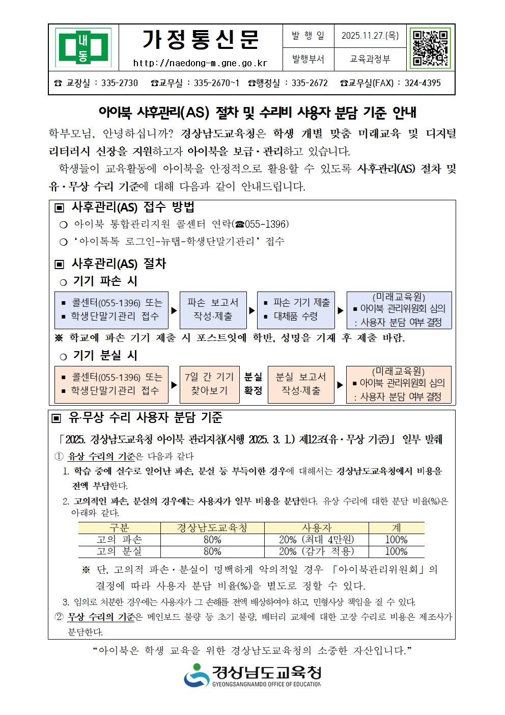 아이북 사후관리(AS) 절차 및 수리비 사용자 분담 기준 안내